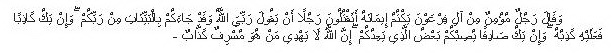 “Dan berkata seorang laki-laki yang beriman dari keluarga Fir’aun yang menyembunyikan keimanannya, “Apakah kamu akan membunuh seseorang karena ia mengatakan, “Tuhanku ialah Allah”, padahal ia telah datang kepadamu dengan tanda-tanda yang nyata dari Tuhanmu? Sekiranya ia seorang pendusta, maka bagi dialah dosa kedustaannya, tetapi jika ia benar, maka sebagian dari apa yang diancamkannya kepadamu akan menimpamu. Sesungguhnya, Allah tidak memberi petunjuk kepada siapa yang melampaui batas dan pendusta ulung.”