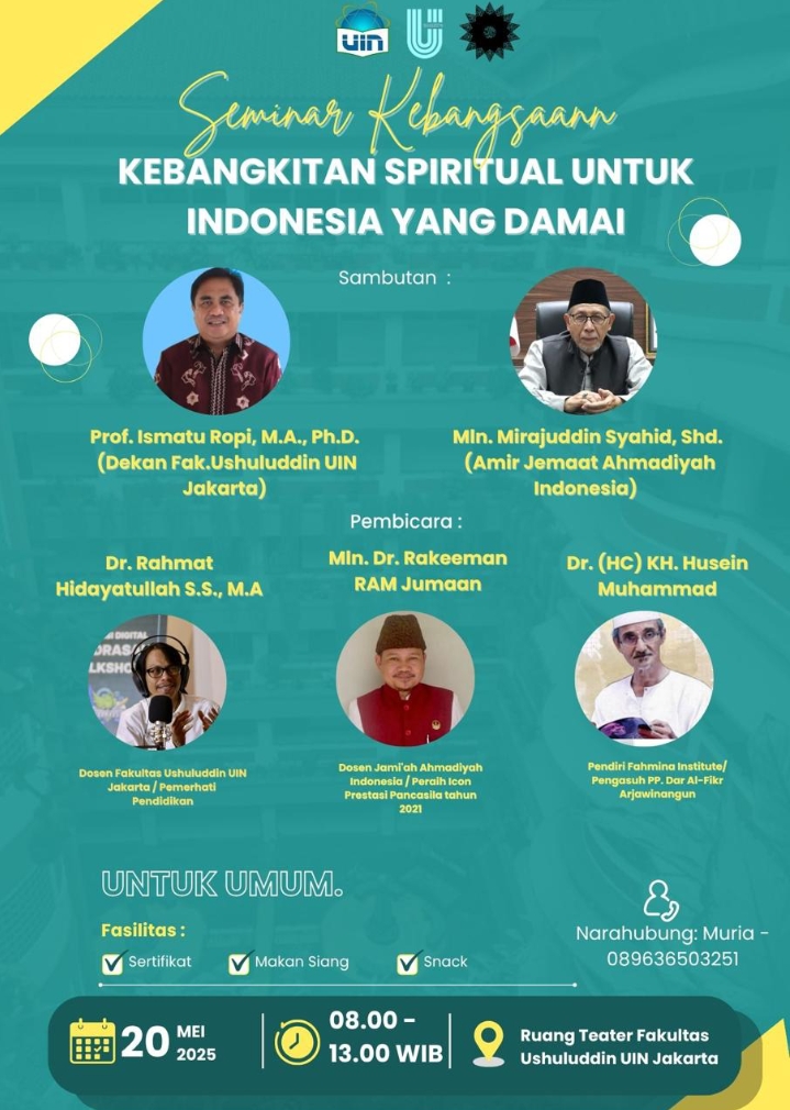 Masroor Library – Jakarta (20/05/2025). Dalam rangka memperingati Hari Kebangkitan Nasional yang jatuh pada hari, Selasa, 20 Mei 2025, Fakultas Ushuluddin UIN Syarif Hidayatullah Jakarta sukses menggelar seminar kebangsaan bertajuk “Kebangkitan Spiritual untuk Indonesia yang Damai”. Acara yang berlangsung di Ruang Teater Fakultas ini menghadirkan lima pemateri terkemuka, yaitu Dekan Fakultas Ushuluddin Prof. Dr. Ismatu Ropi, Amir Jemaat Ahmadiyah Mirajudin Sahid, Dosen Fakultas Ushuluddin Dr. Rahmad Hidayatullah, Dosen Jemaah Ahmadiyah Rakeeman Jumaan, dan Pendiri Fahmima Institut KH. Husein Muhammad.