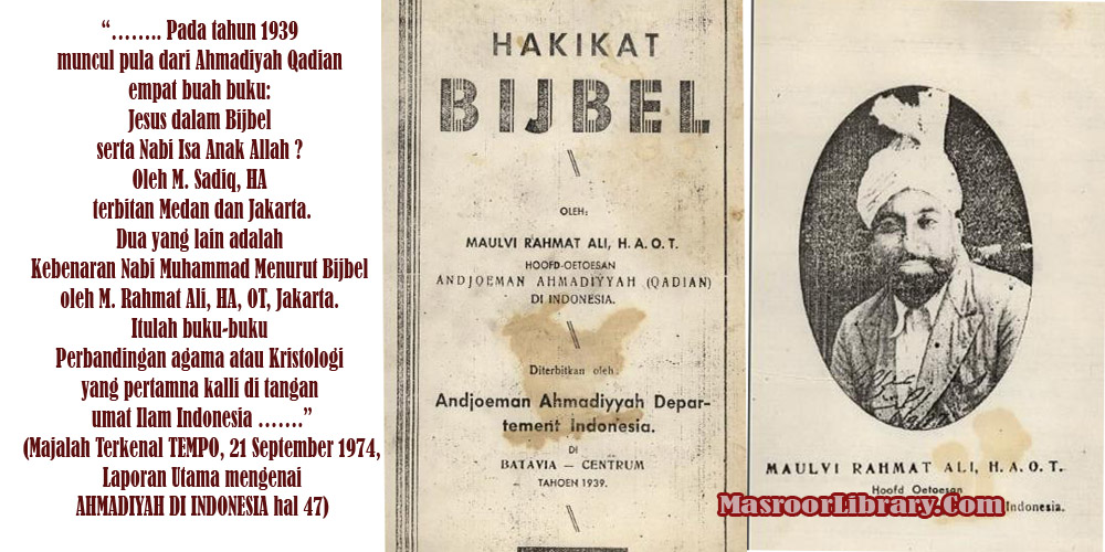 “….. Pada tahun 1937 muncul pula dari Ahmadiyah Wadian empat buah buku: Jesus dalam Bijbel serta Nabi Isa Anak Allah? Oleh M Sadiq, HA terbitan Medan dan Jakarta. Dua yang lain adalah Kebenaran Nabi Muhammad Menurut Bijbel oleh M Rahmat Ali, HA. OT. Jakarta . Itulah buku-buku perbandingan agama atau Krstologi yang pertama kali di tangan umat Islam Indonesia….”