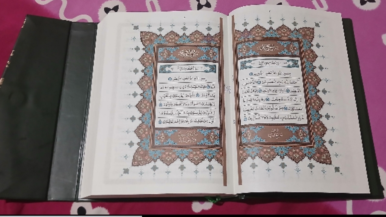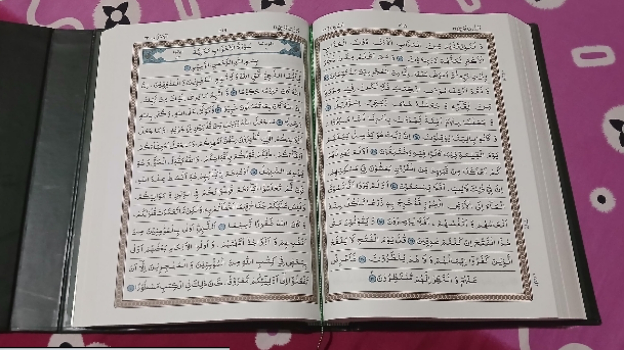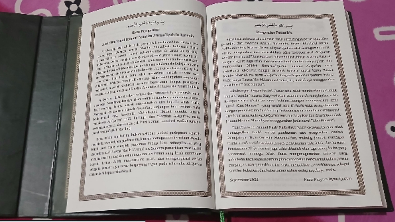 [9] Disini ada yang agak mengganggu kaitannya dengan Mushaf Al-Qur’an, yaitu, biasanya bagian cover luar tidak ada huruf lain. Tetapi dalam Mushaf Kitab Suci Al-Qur’an ini mencantumkan terjemahan huruf latin.